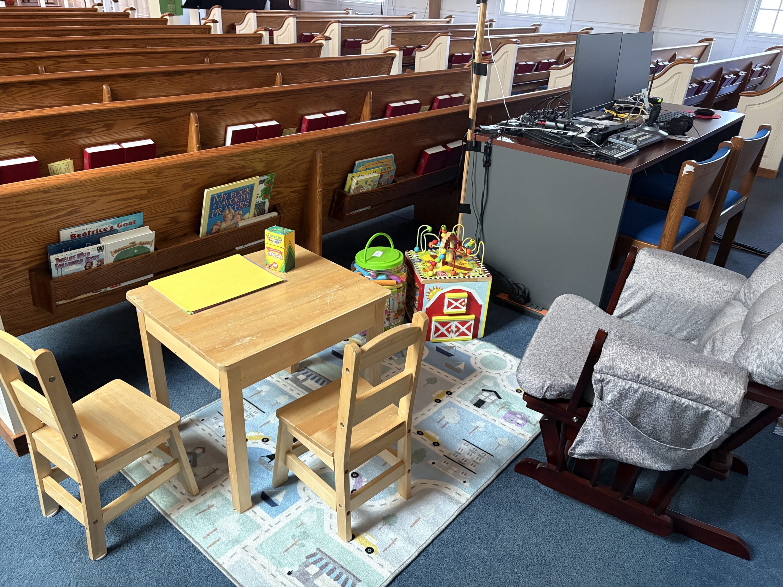 We expect children! Children are invited to leave the worship space after the children’s message for Sunday School during the school year, but we don’t expect that they all will. We love to hear the sights and sounds of children throughout the service. We have “busy bags” and a “prayground” area behind the last pews of the worship space for those who would like to color, read, or otherwise multitask during the service.